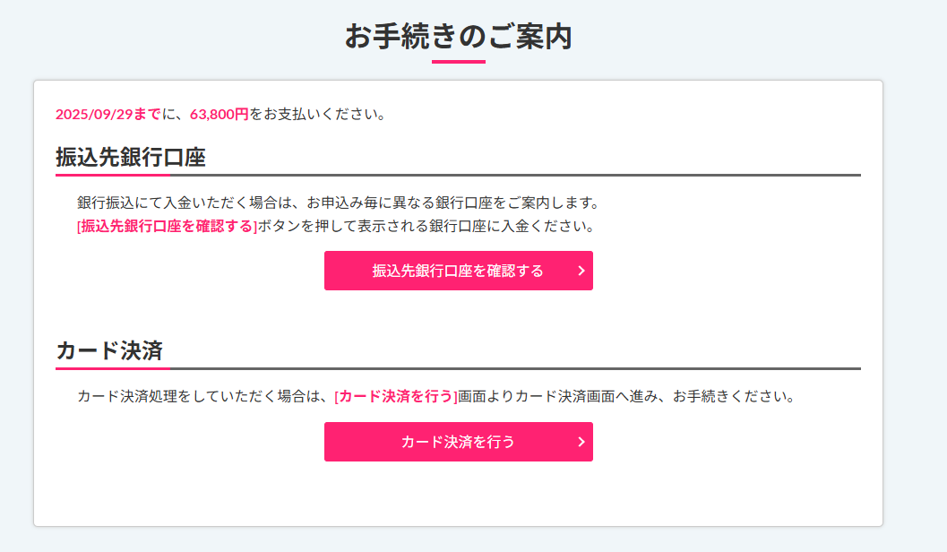 申し込み完了後の画面にて、「銀行振込」または「カード決済」をお選びいただけます。 - 入金確認(有料の場合)