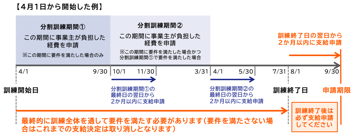 人材開発支援助成金は通常、「訓練終了後2カ月以内に支給申請を行う」とされています。それが、訓練開始日から6カ月ごとに区切った期間に条件を満たせば、研修費用とその期間の賃金について、助成金の申請が可能です。