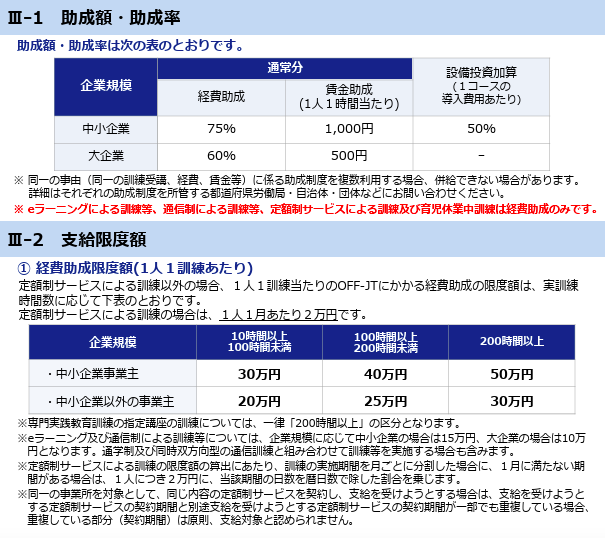 助成率と助成額、受講者1人あたりの経費助成限度額は以下の通りです。