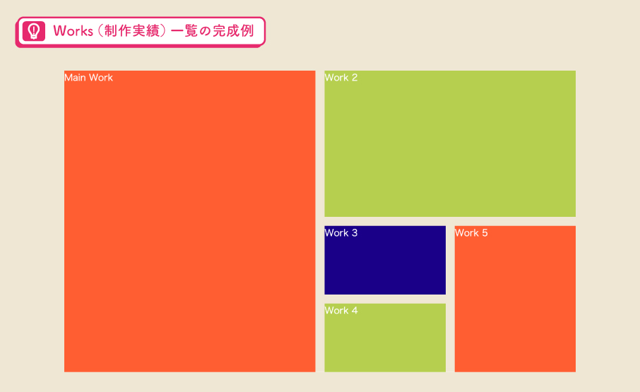 Flexboxで横一列に作品を並べるのも良いですが、ボックスの大きさに変化をつけて、マンネリ化しがちなレイアウトを打破することができますよ。