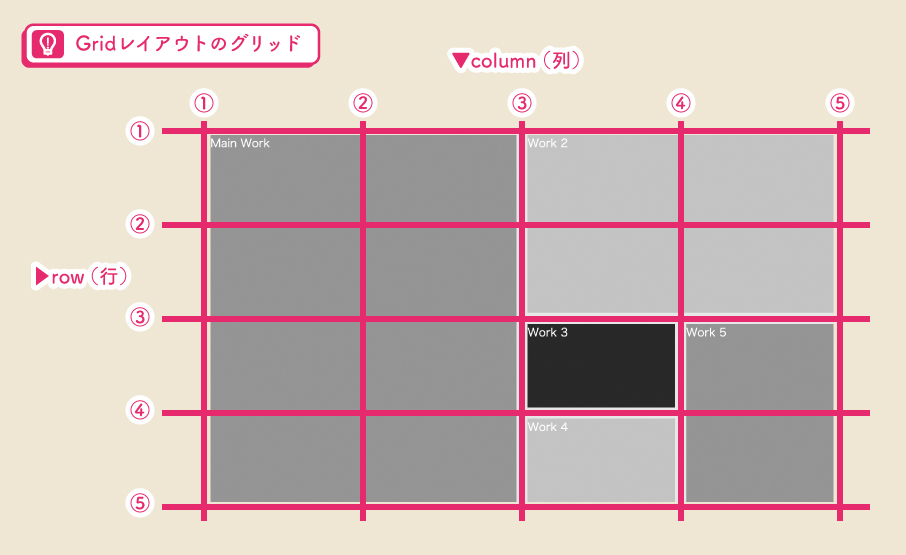 まず行と列でグリッドを引き、「そこに何を置くか」を決めていきます。