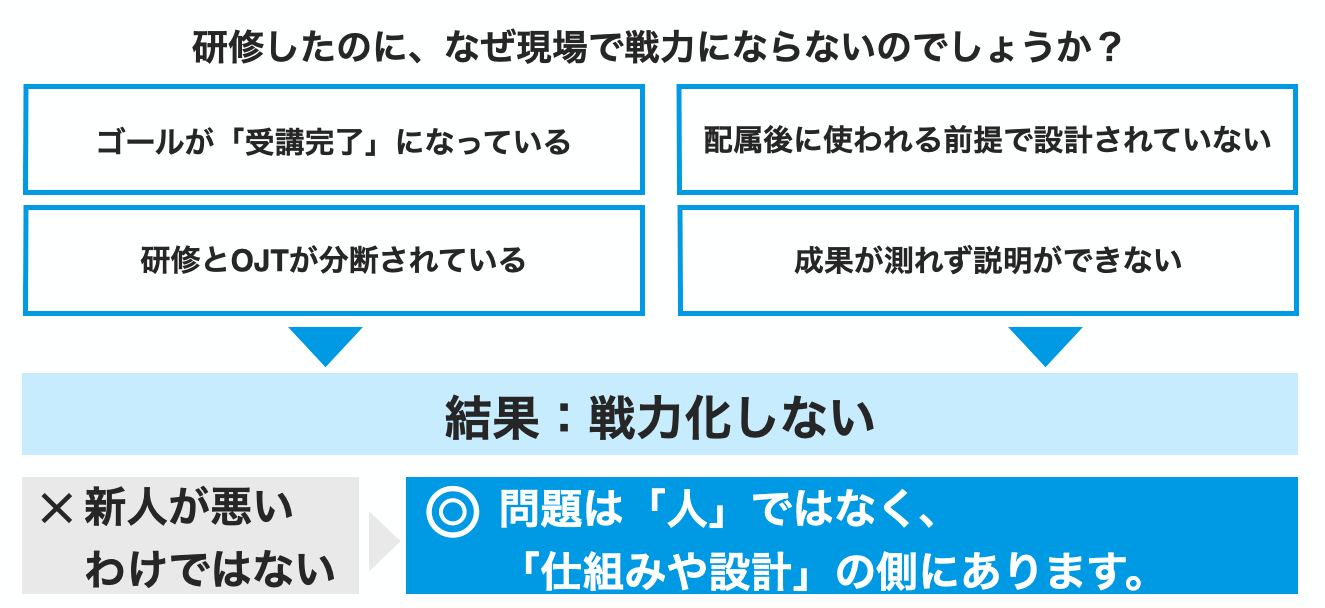 そもそも研修を受けたはずなのに新人が戦力にならないのは、研修の内容でなくその設計に構造的な問題があるからです。