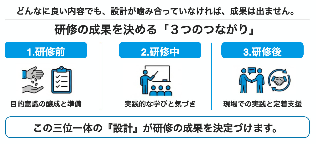 このように、研修前・研修中・研修後を一体で捉えた「三位一体の設計」こそが、研修の成果を左右する重要なポイントです。