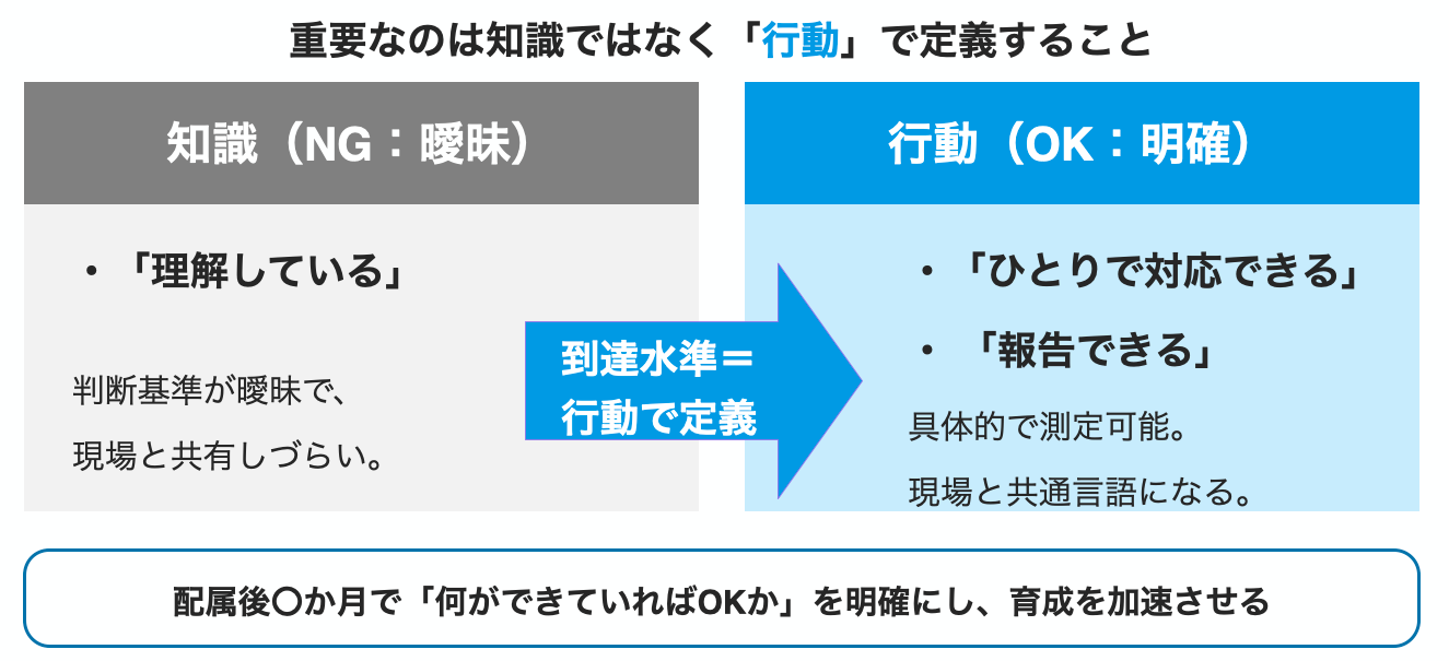 到達水準の可視化は、行動で定義することが重要です。例えば「配属後〇カ月で〇〇を一人で対応できる」のように設定します。