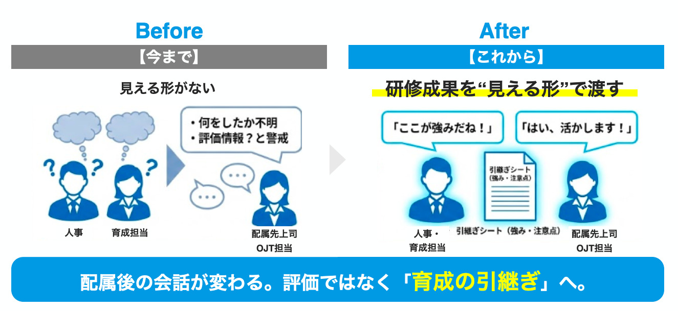 前項でお伝えした引継ぎ基準を研修と配属の間に設け、到達水準を可視化します。