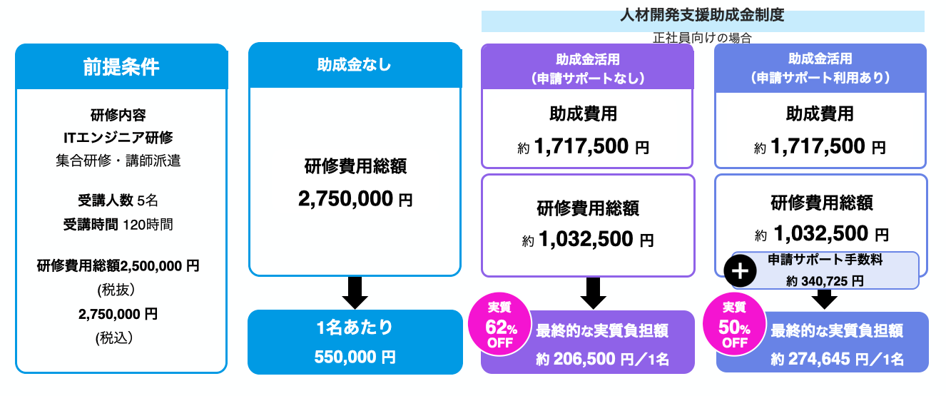 この事例では、助成金を活用しない場合、1人あたり約55万円の研修費用が発生します。