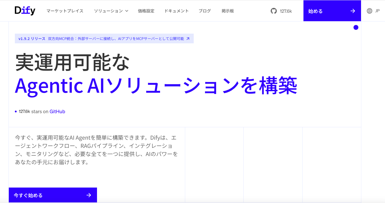 1.Dify(https://dify.ai/jp)のページ画面から右上の「始める」をクリック。
