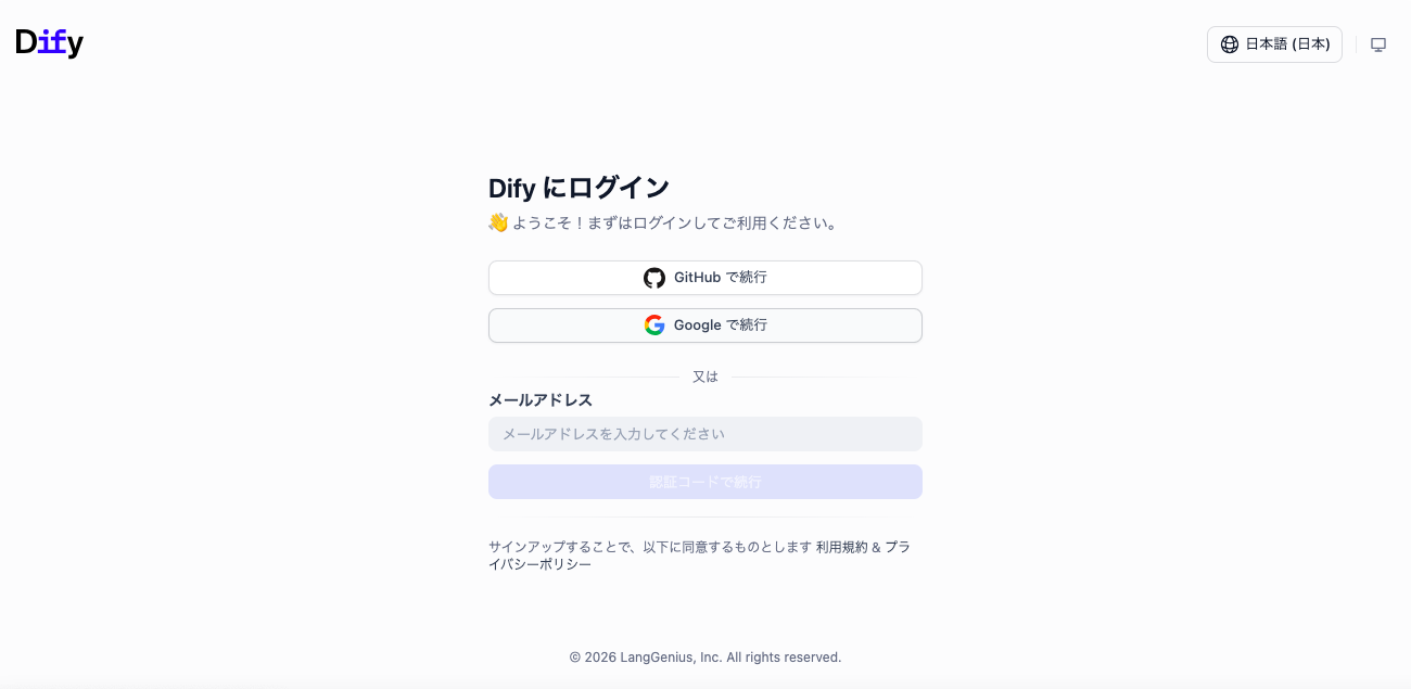 Difyのアカウント作成・ログイン手順はとてもシンプルです。