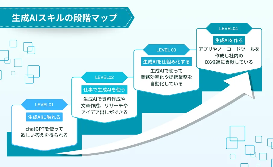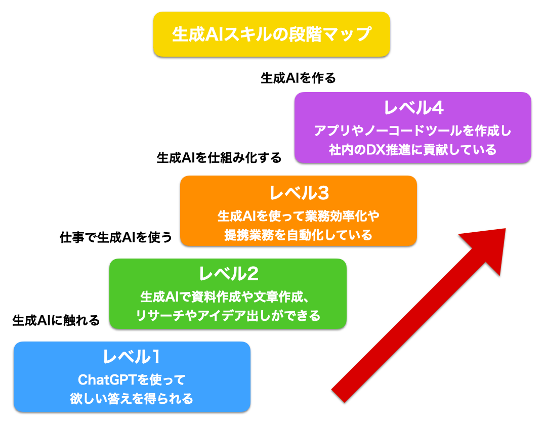 具体的に生成AIのスキルは以下の4段階に分けられます。