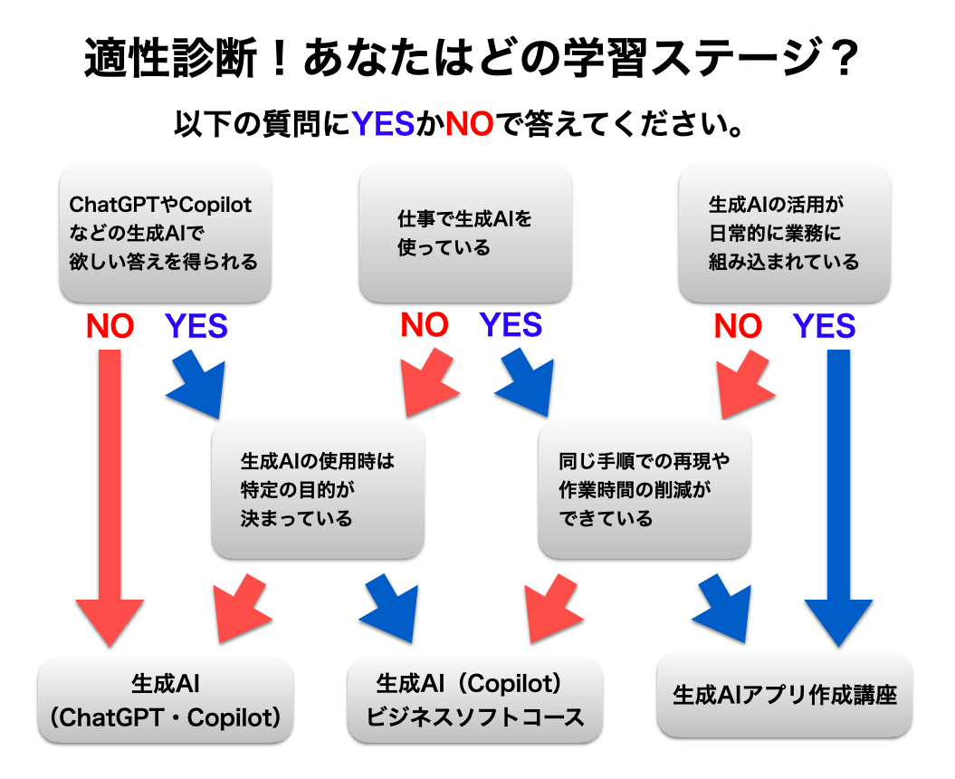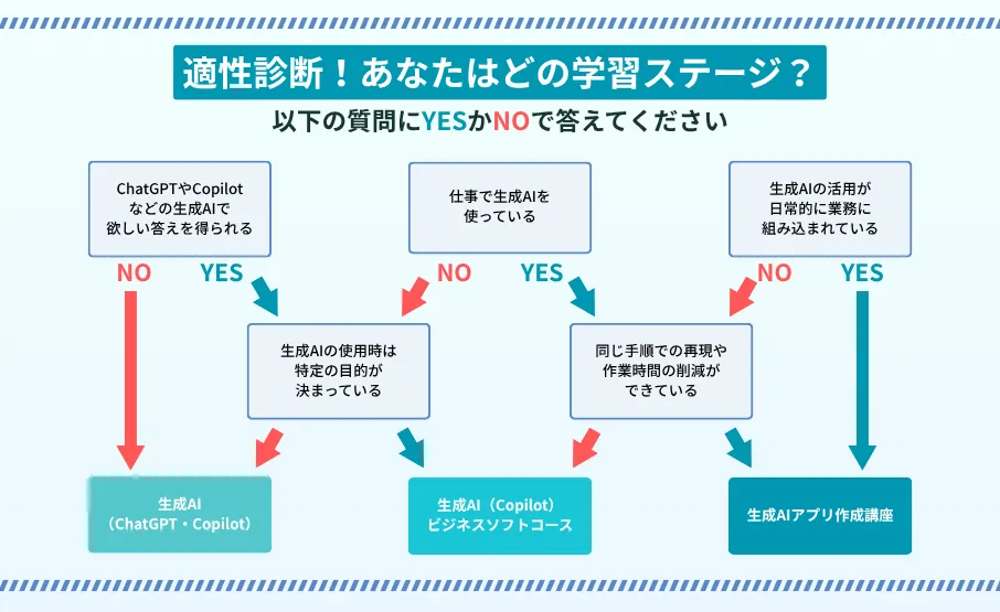 ここまで、あなたの生成AIに対する自身のレベルを把握できたと思います。そこで、各レベルに応じてどの生成AIを学べばよいか改めて考えてみましょう。